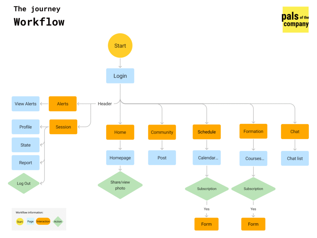 Tras identificar los puntos a mejorar, definí el workflow para mapear cómo los empleados navegan por la intranet —desde el login hasta áreas como comunidad, calendario, formación o chat— y así identificar las interacciones clave y mejorar la experiencia de uso.