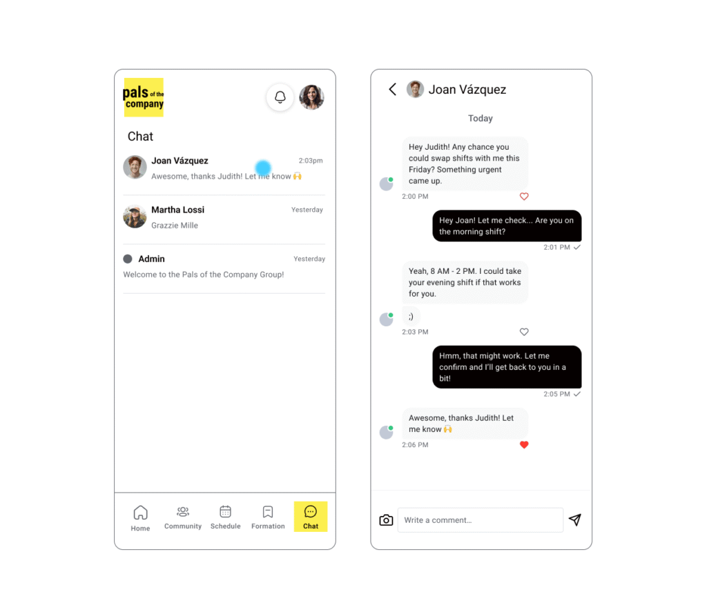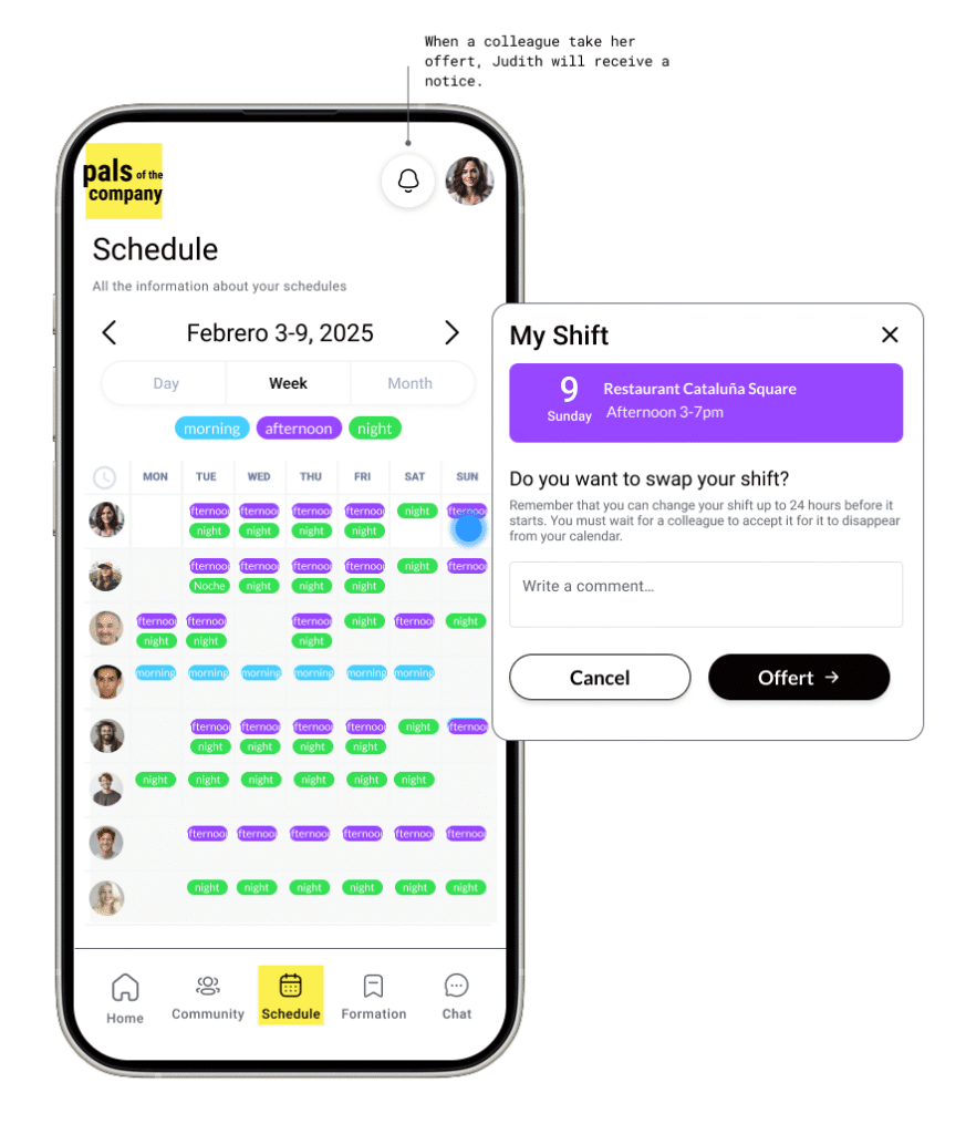 A través de una interfaz intuitiva donde los empleados pueden intercambiar mensajes, coordinar cambios de turno y recibir actualizaciones en tiempo real.