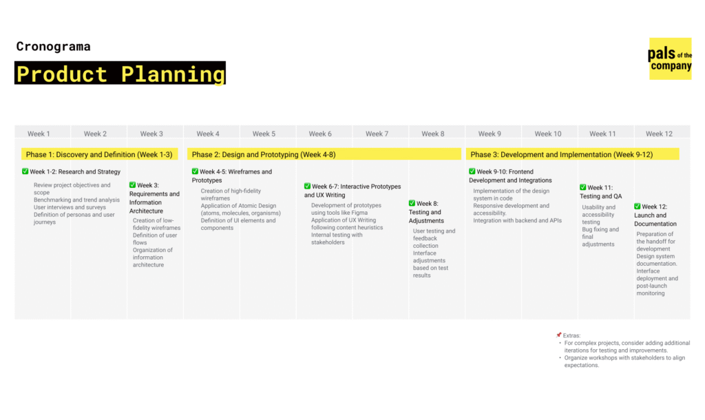 Con este flujo claro, elaboré un cronograma que organiza el proyecto en fases semanales: investigación, diseño, prototipado, pruebas y desarrollo final. Este plan permite coordinar al equipo, anticipar posibles bloqueos y asegurar un avance estructurado hacia los objetivos del proyecto: crear una comunidad interna activa, facilitar el aprendizaje, mejorar la comunicación y ofrecer información actualizada a los empleados.