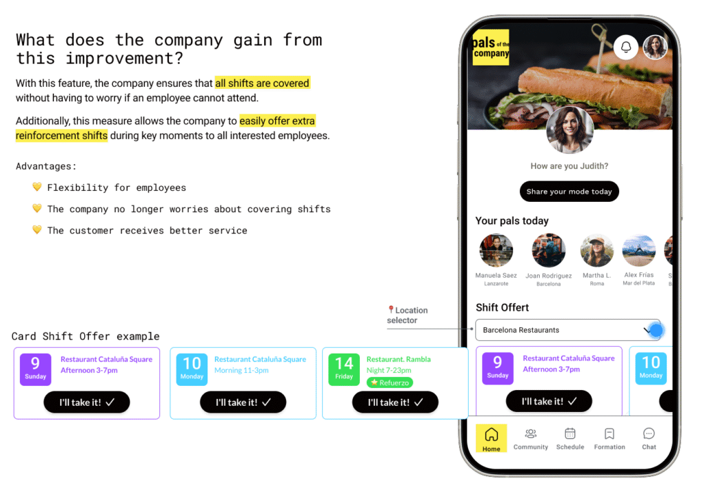Además, My Shift permite a la empresa ofrecer fácilmente turnos extra en momentos de alta demanda, asegurando que todos los empleados interesados puedan acceder a oportunidades adicionales de trabajo.