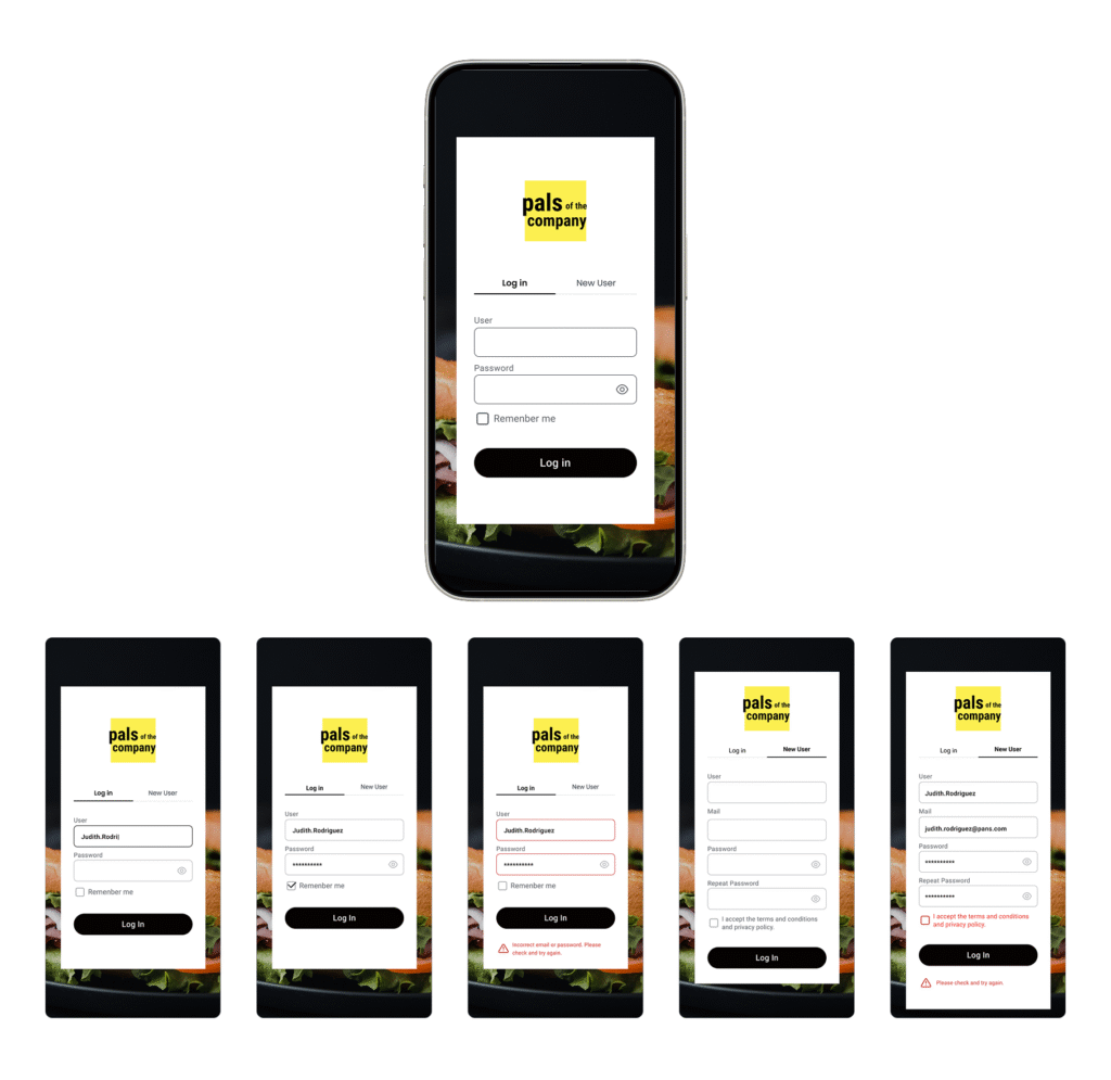 Estos wireframes representan la estructura inicial de la experiencia de Pals of the Company. Su objetivo es definir la jerarquía de información, los flujos principales y la distribución de los elementos clave antes de pasar a fases de diseño visual.